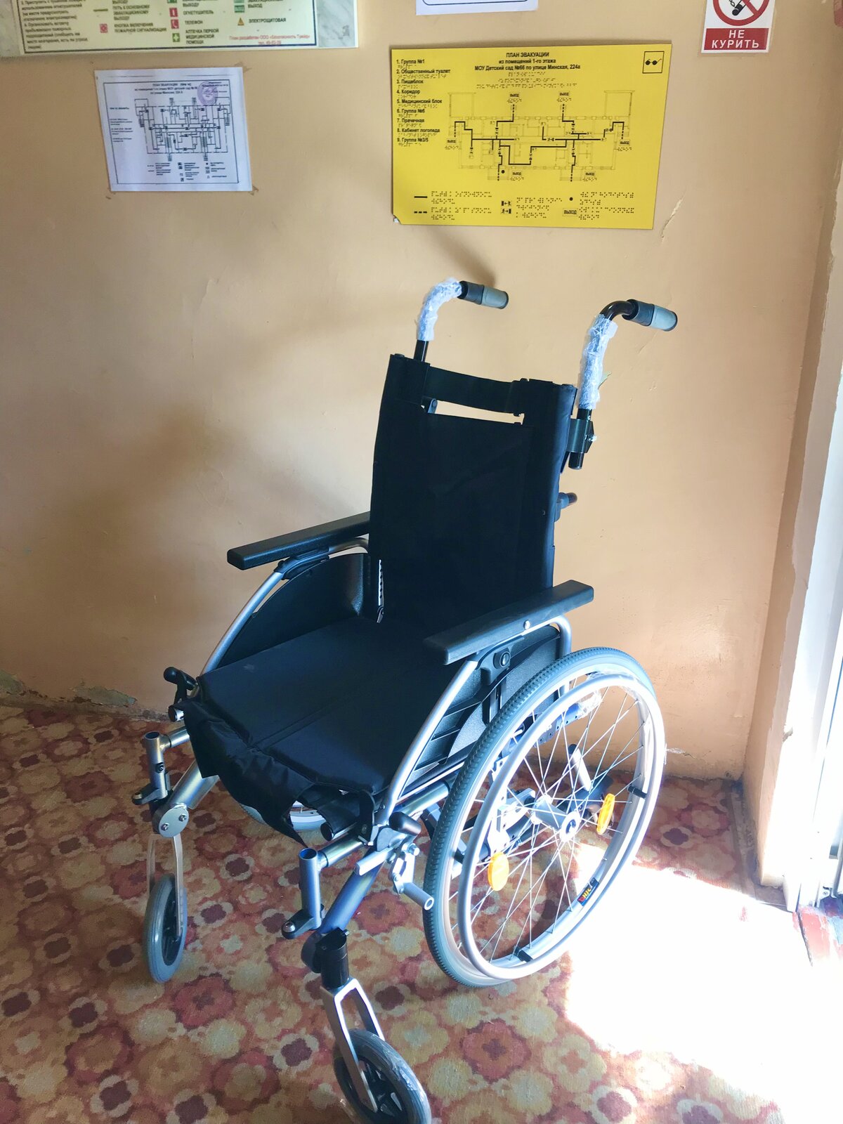 Ступеньки к зданию и внутри здания, входные двери оснащены цветовыми полосками и кругами.
