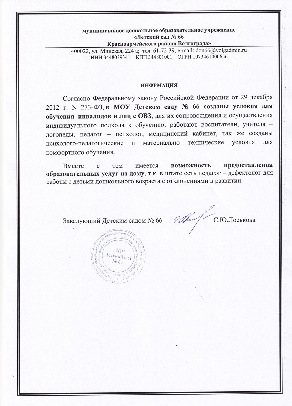 На данной странице вы найдете информацию о реализации программы "Доступная среда" в МОУ Детском саду № 66.